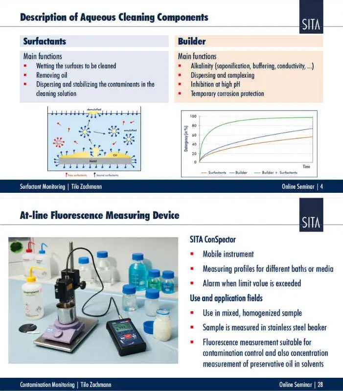 内容:本场研讨会聚焦工业清洗过程中清洗槽的污染问题,讲解如何量化监控表面活性剂浓度。借助析塔SITA DynoTester+动态表面张力仪和SITA ConSpector污染度仪,您可以掌握表面活性剂浓度及清洗槽污染状况,高效监控相关指标,从而有效延长清洗槽液的使用寿命。